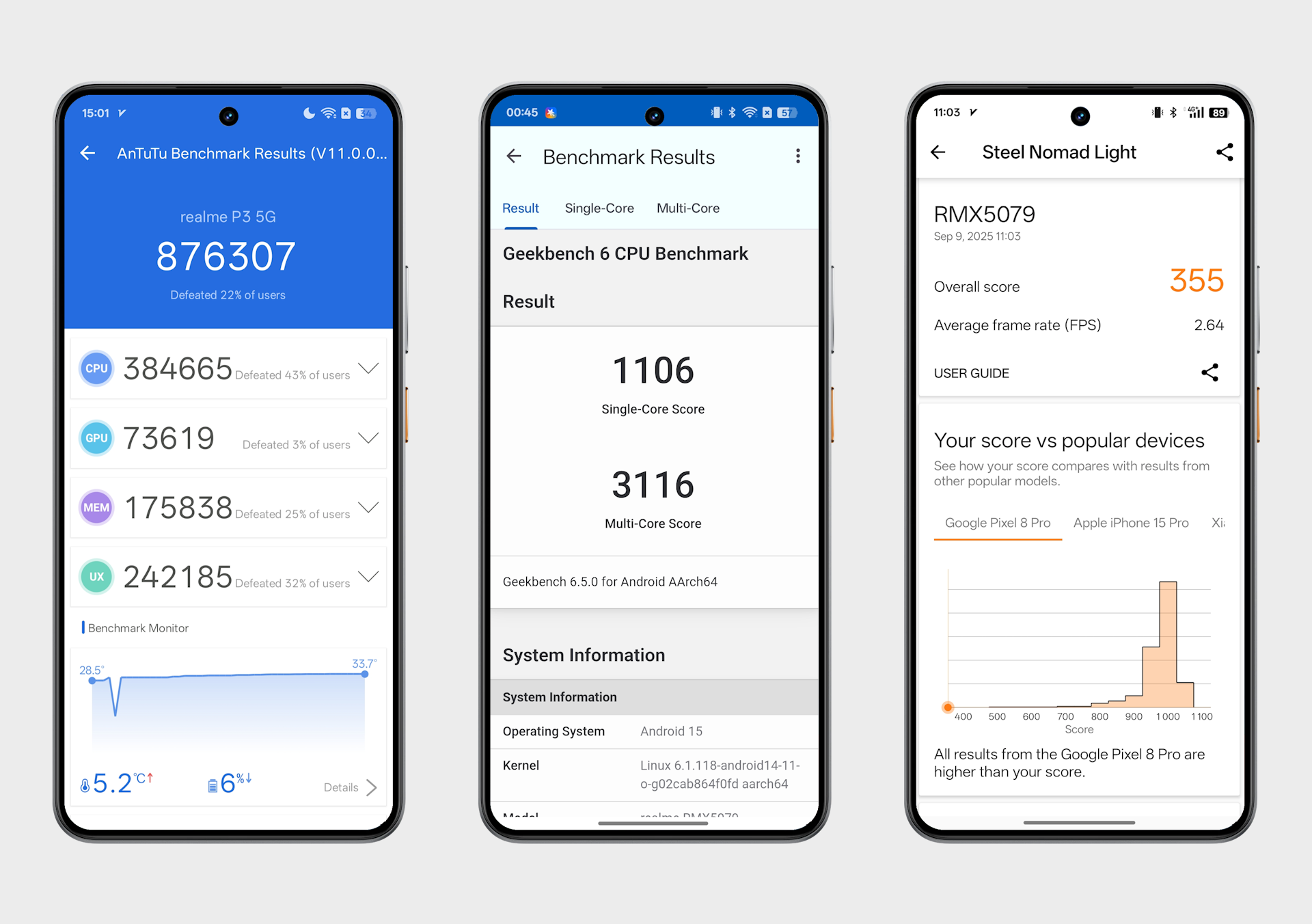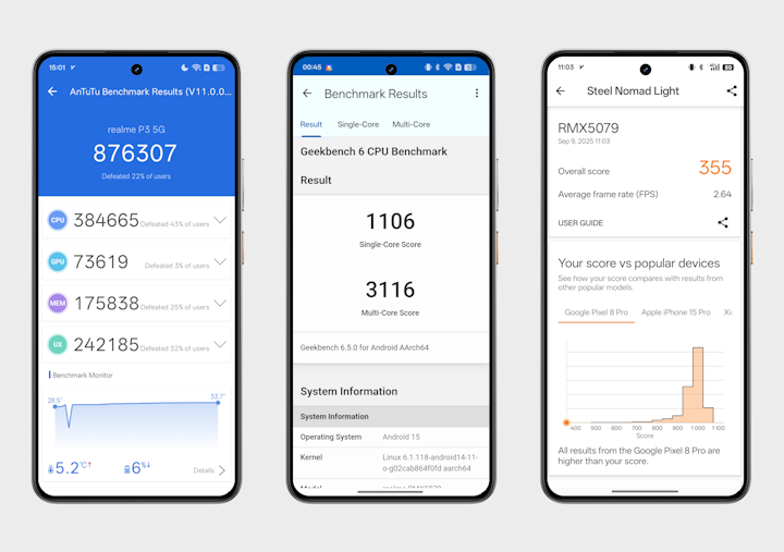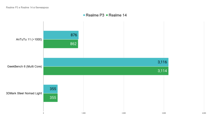 С учётом одинаковых характеристик, забавно, что в промо-материалах Realme обещает для Realme 14 более высокие результаты в бенчмарках. В реальности чудес не произошло и результаты у моделей  примерно одинаковые.