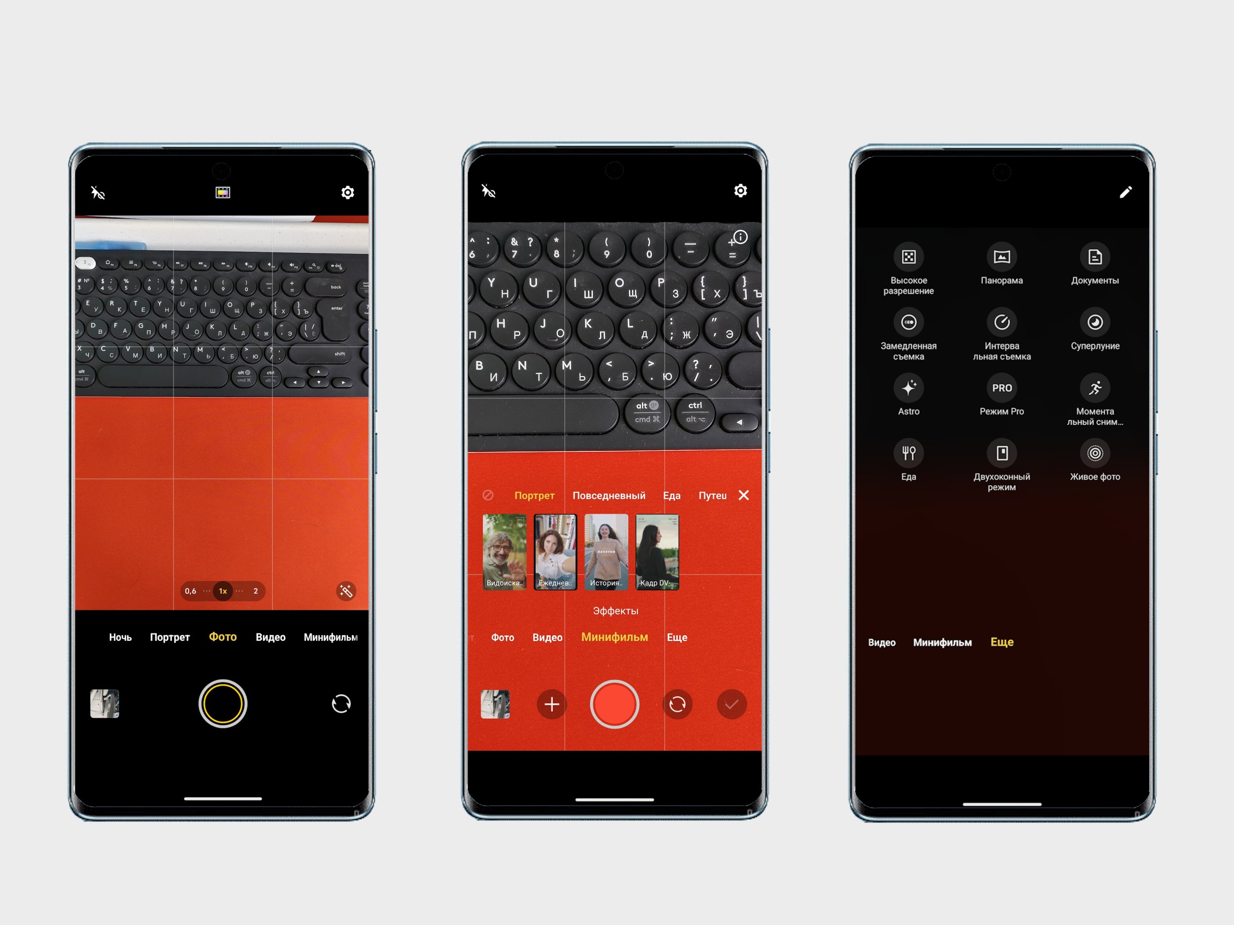 В приложении есть все базовые режимы: стандартное фото с автонастройками, ночной и портретный режимы, есть «Профессиональный» режим с ручными настройками и несколько дополнительных, привычных по большинству других смартфонов. Из интересного — «минифильмы». Это такой набор шаблонов для коротких вертикальных роликов. Кто снимает рилсы и подобное, вероятно, оценят.