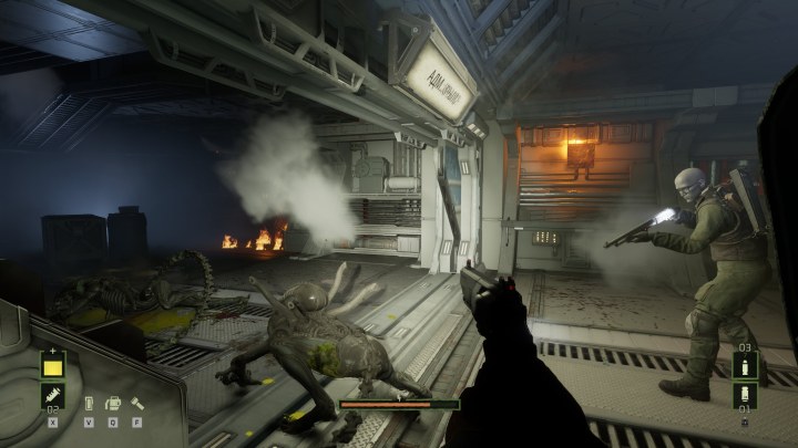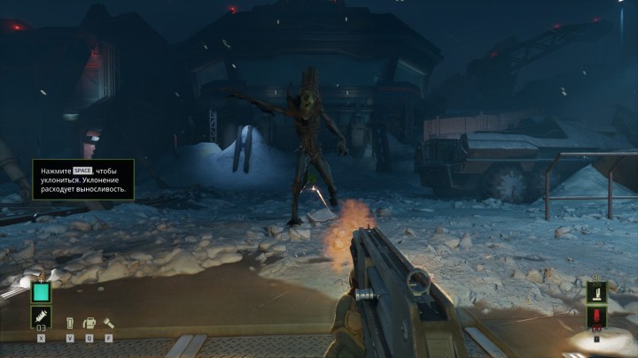 Общая обстановка намекает на присутствие жутких монстров, и очень быстро мы сталкиваемся с первым ксеноморфом. Вместо ужаса, который таится в темных коридорах или отсеках корабля, мы наблюдаем фигуру на фоне молний. Потом монстр быстро спускается, бежит к нам и умирает от очереди из импульсной винтовки. Сопровождается все это плохой анимацией и не менее плохим ощущением от стрельбы. Поэтому буквально за пару минут приходит полное ощущение разочарования. Если нам так презентуют первого монстра, то насколько плохо все будет потом?