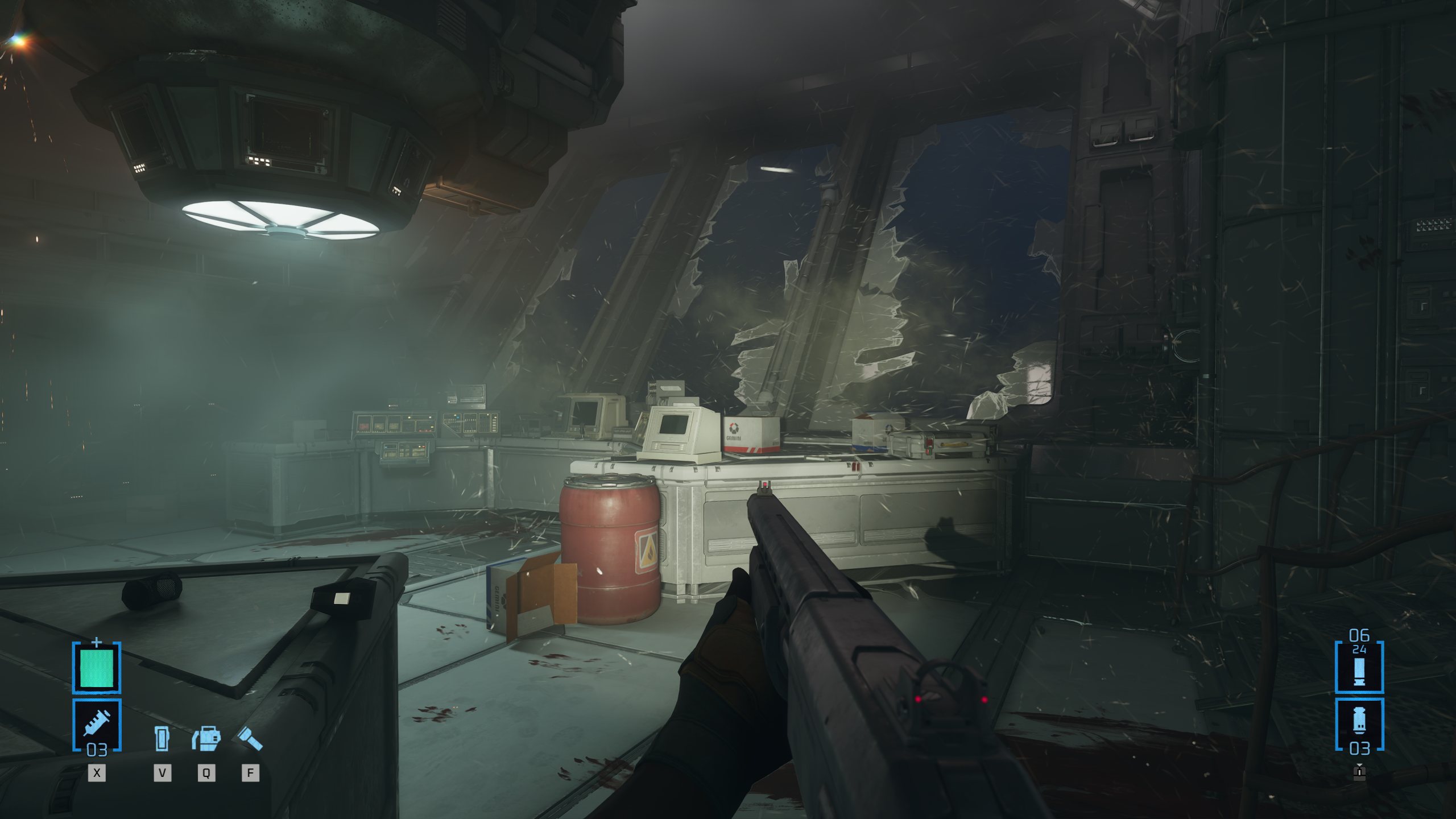 Вступление демонстрирует разные игровые элементы и механики, которые не связаны со стрельбой —подключение к терминалам, открытие дверей с помощью выстрела, ремонт и мини-игра с настройкой электроцепи, чтобы подать питание на нужную дверь. Попутно мы собираем припасы и изучаем разные шкафчики, наблюдая кровавые следы и разбитые окна. Многие объекты можно брать в руки и бросать — смысла в этом нет, просто осталось в наследство от VR-версии, где все их можно вертеть, а из ящиков игрок вытряхивал припасы.