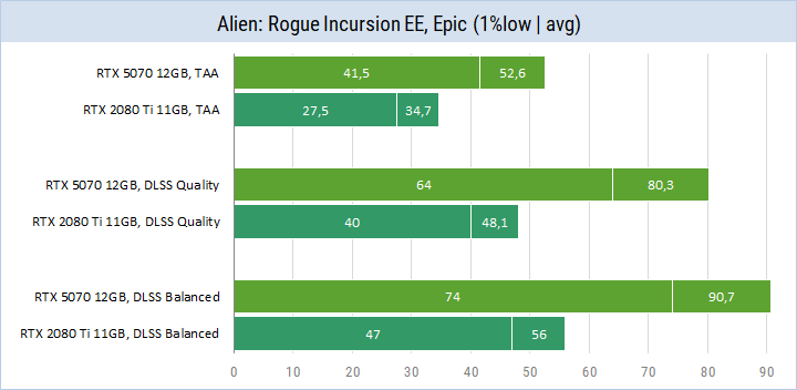 Разница между GeForce RTX 5070 и GeForce RTX 2080 Ti варьируется от 40% в низком разрешении до 52% в 4K. Результаты GeForce RTX 2080 Ti дают примерное представление о потенциале GeForce RTX 3070 и RTX 5060, и все они обеспечат хорошие показатели в форматах 1080p и 1440p. GeForce RTX 5070 немного не хватает для высокой производительности в нативном 4K, но с этим должна отлично справиться видеокарта GeForce RTX 5070 Ti.