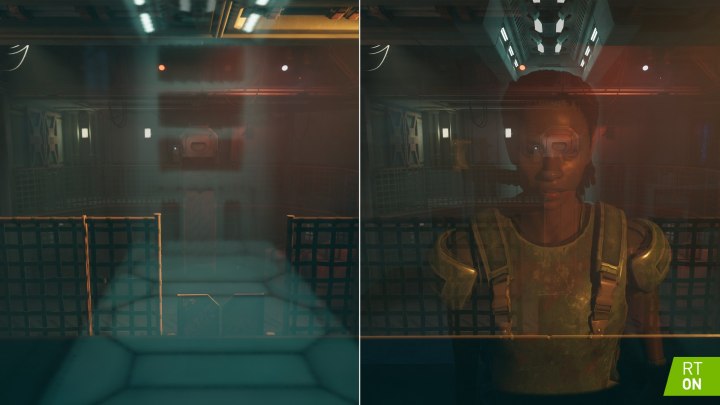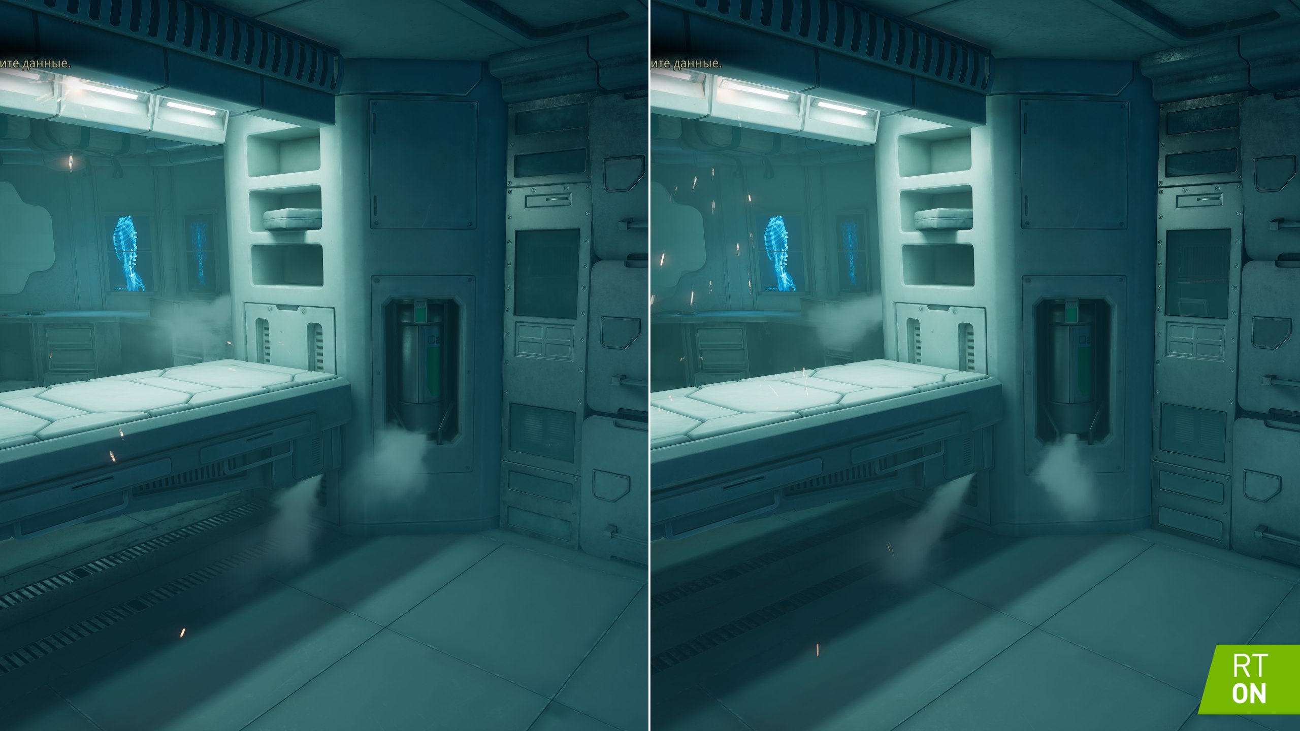 Трассировка влияет на отражающие свойства металлических и полупрозрачных поверхностей. Технология добавляет точные отражения на стеклах и немного меняет восприятие внутренних коридоров с металлической обшивкой.