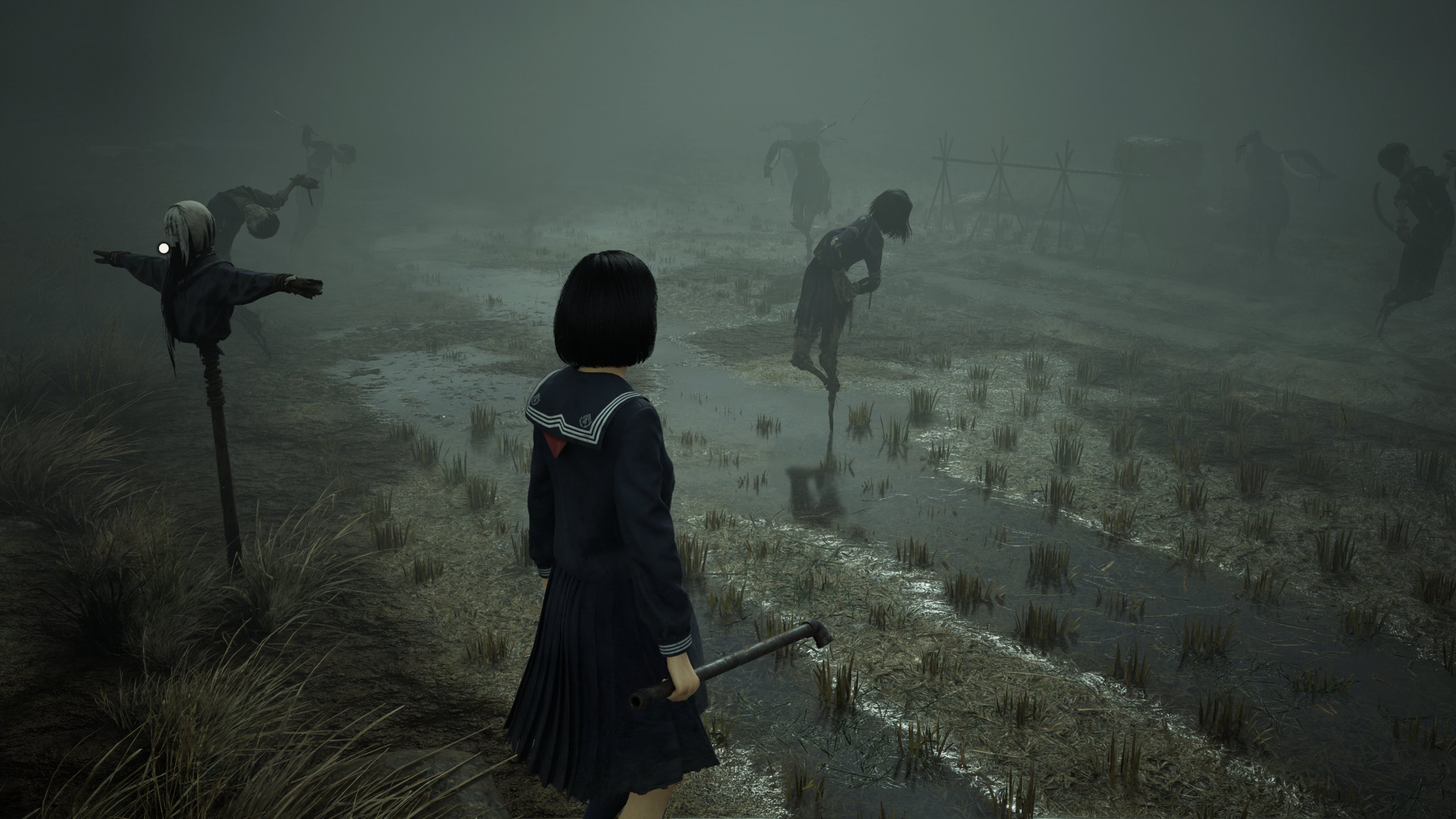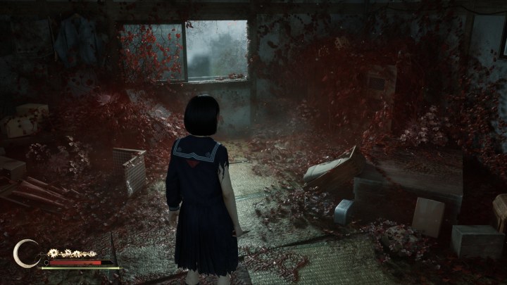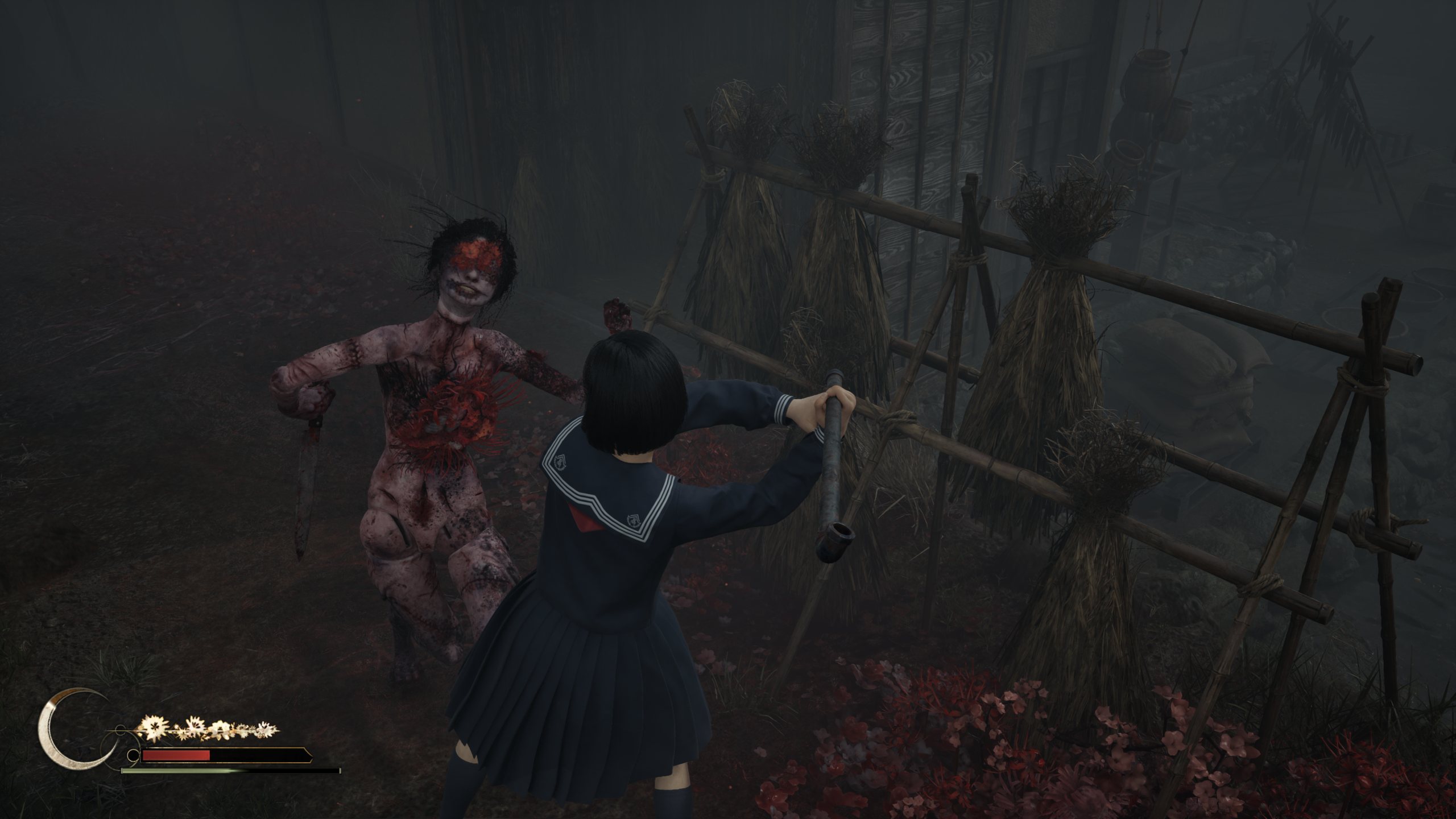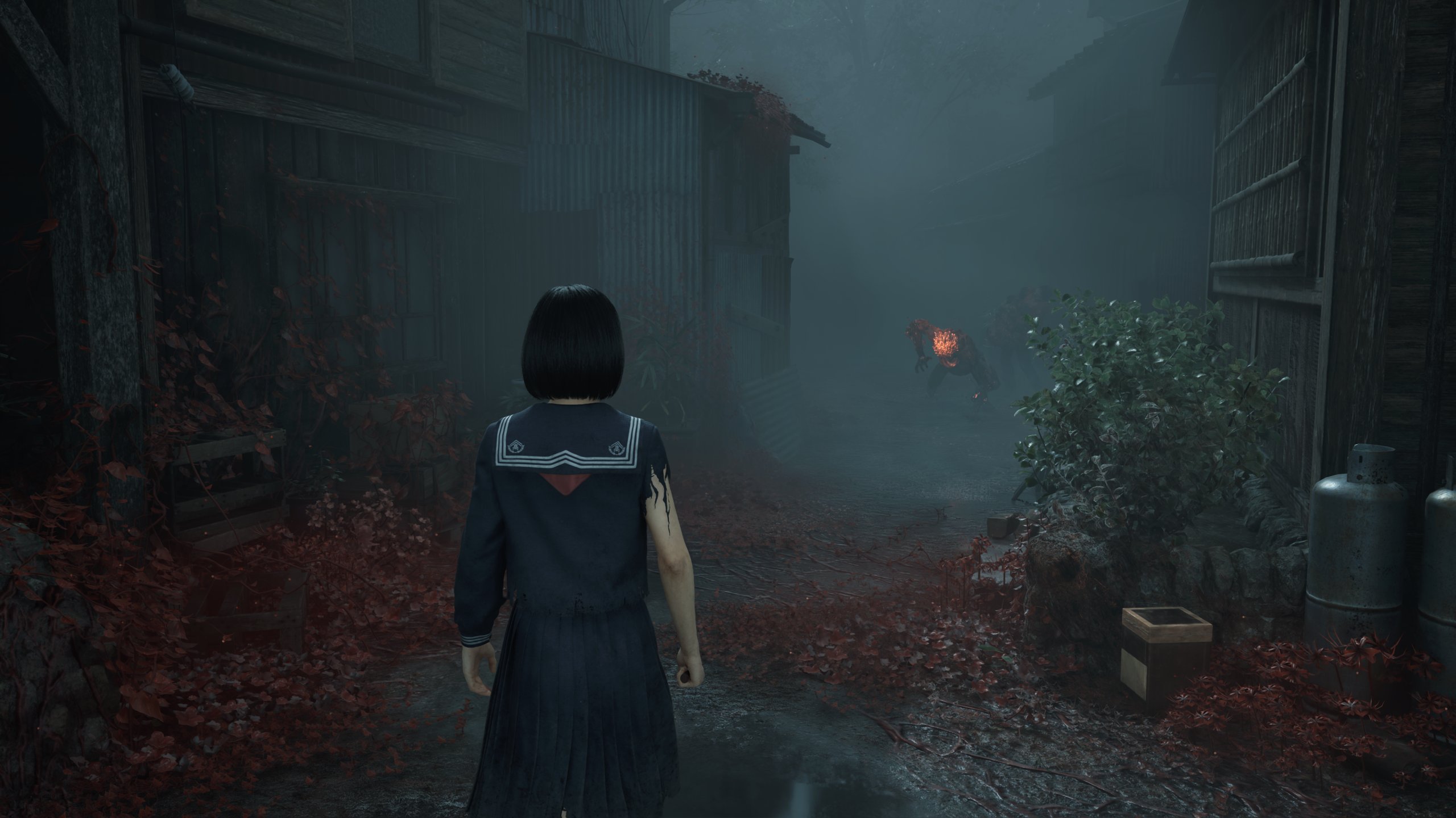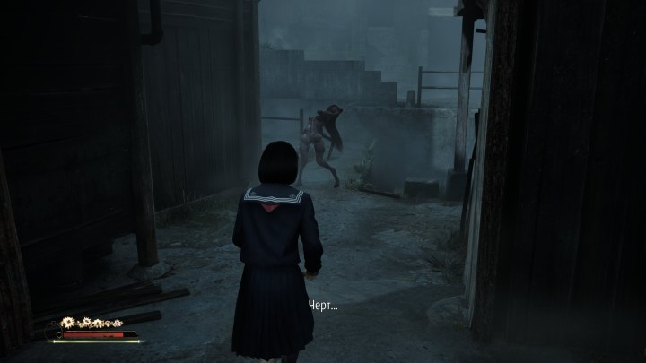 Сражения нельзя назвать простыми, особенно на первых этапах. Каждый враг представляет опасность и может быстро убить девочку. Также Silent Hill f умело воссоздает ощущение тревожного ожидания от встречи с врагом, который таится в тумане. Вы идете в условиях плохой видимости, погружаясь в густой туман и музыкальный эмбиент, который даже без радиоприемника умело подчеркивает усилением шума приближение к опасности. Потом из тумана появляется фигура, которая поначалу безразлична к вам, но стоит подойти ближе — она резко оборачивается и направляется в вашу сторону. Есть в этом вязкая жуткая атмосфера, которая сопровождала оригинальные игры — пугающая и притягательная в своей неизвестности.
