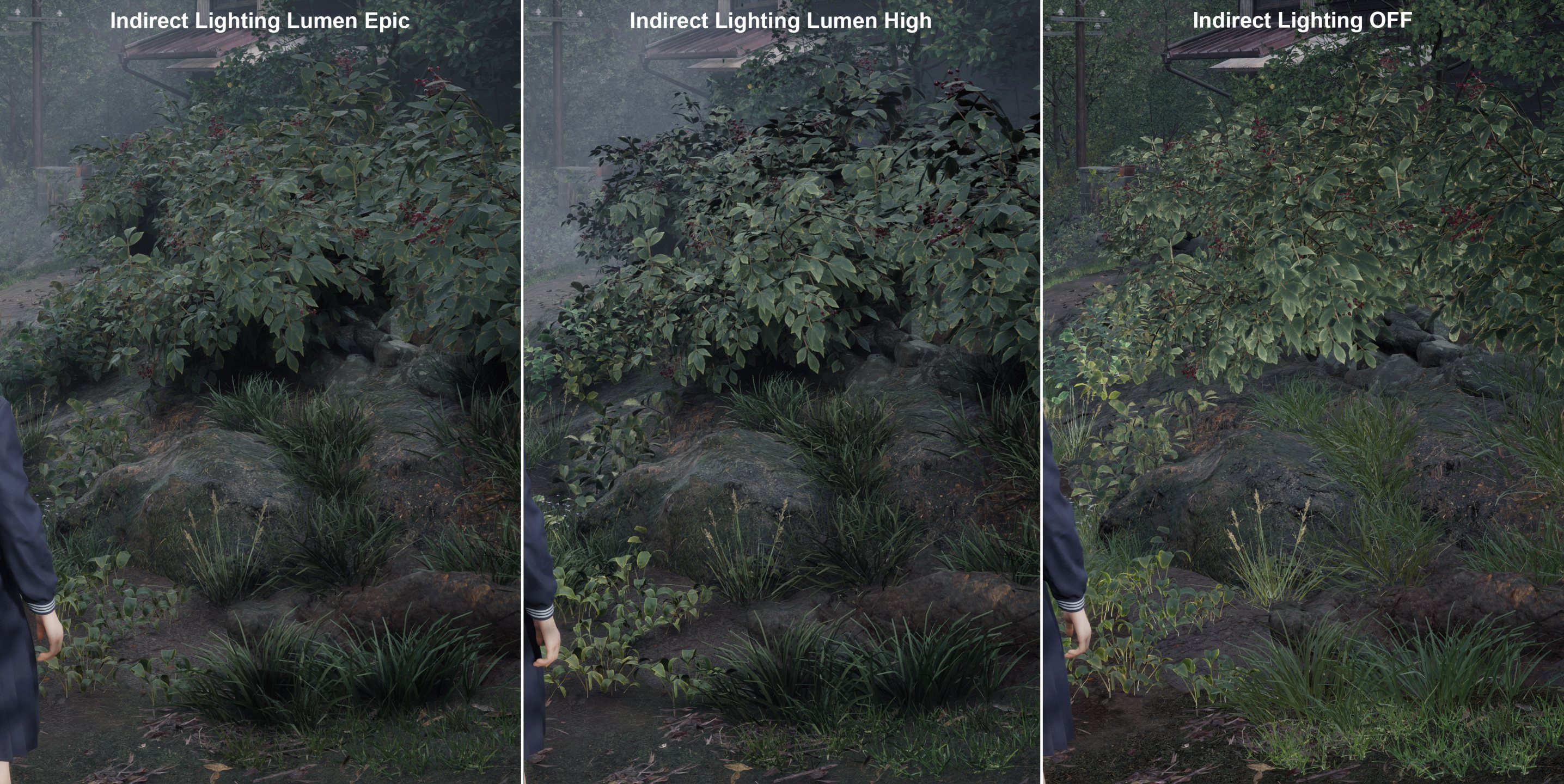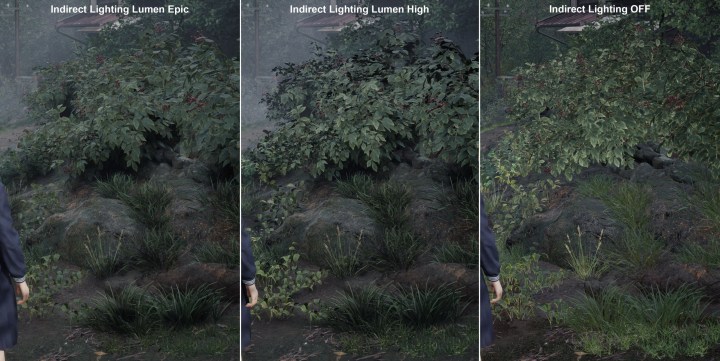 Картинка без Global Illumination с Lumen сразу теряет глубину, ей катастрофически не хватает фонового затенения. Между максимальным и высоким качеством Lumen разница в некоторые моменты заметная, но в целом она не критическая.