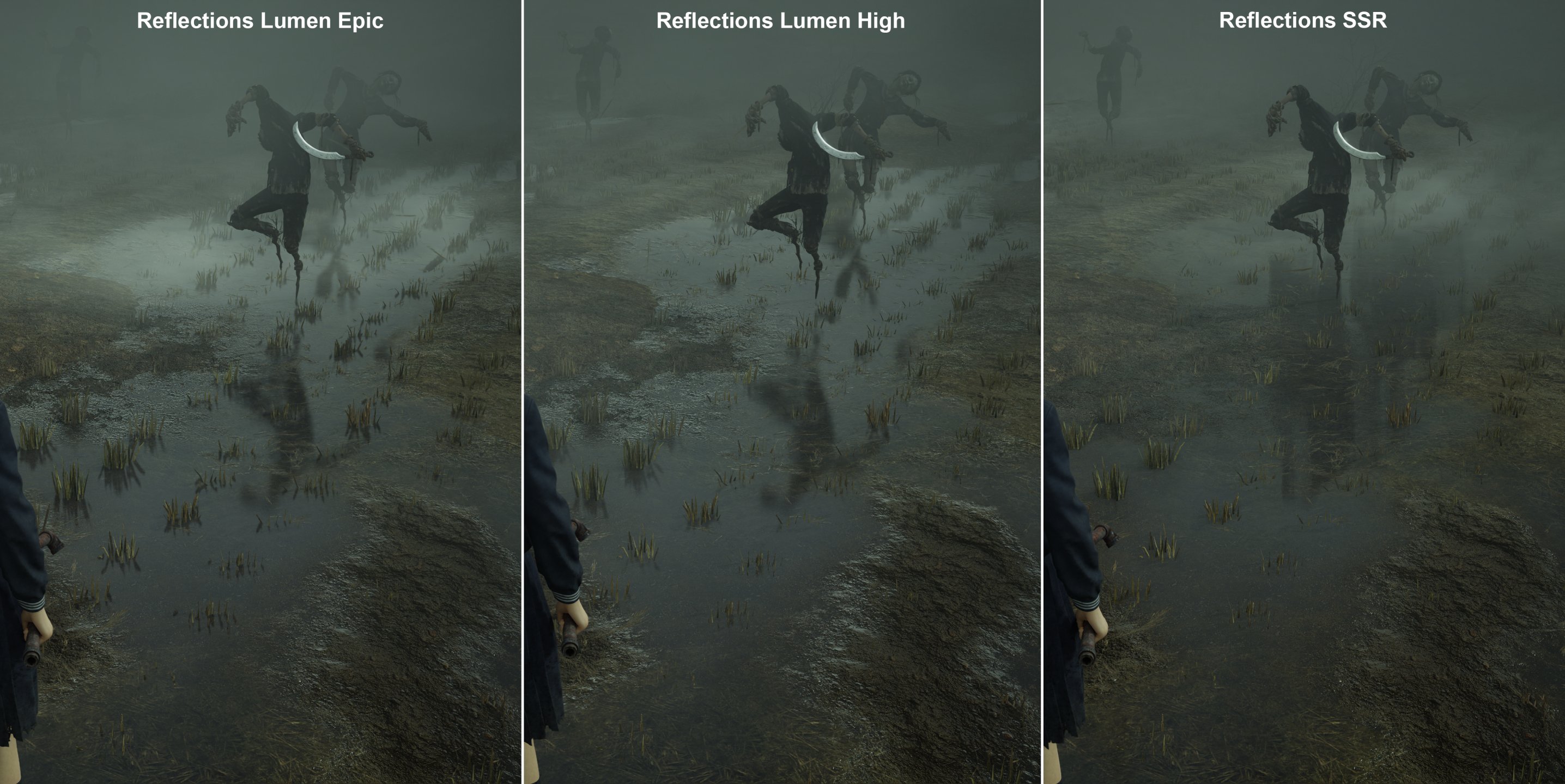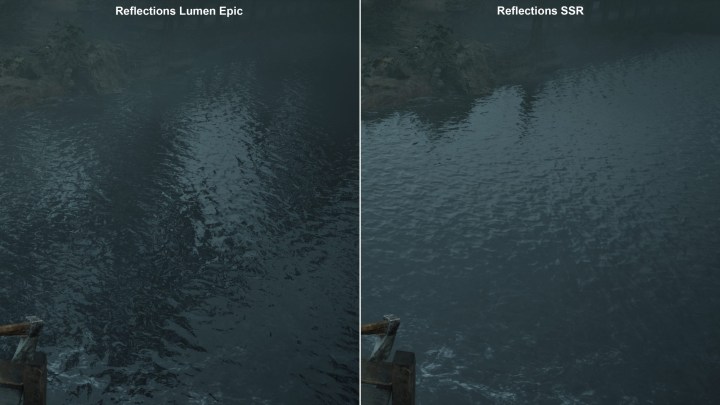 Отражения с максимальными и высокими настройками Lumen отличаются слабо. А вот переход к SSR заметен хорошо —отражения хуже, точность ниже. Вроде бы не критично, но в некоторых сценах это меняет общее впечатление.