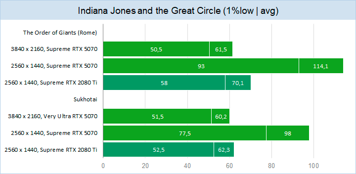 Эту сцену сравним с производительностью на самой ресурсоемкой локации основной игры — в Сукхотае. Ниже результаты GeForce RTX 5070 в форматах 1440p и 4K, а также результаты GeForce RTX 2080 Ti в разрешении 1440p. Трассировка пути выключена, основные настройки в режиме Supreme, но для 4K в Сукхотае включен режим Very Ultra.