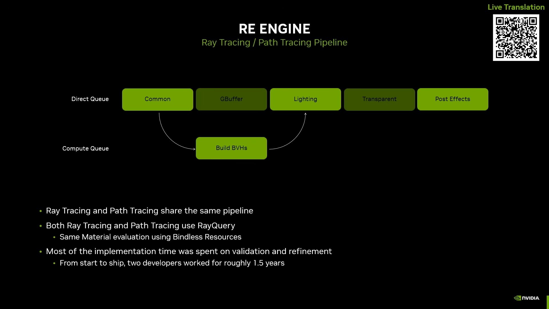Разработчики интегрировали единый конвейер для трассировки лучей и трассировки пути. Построение BVH (Bounding Volume Hierarchy) выполняется через асинхронные вычисления с единым вызовами для лучей и шейдеров материалов.