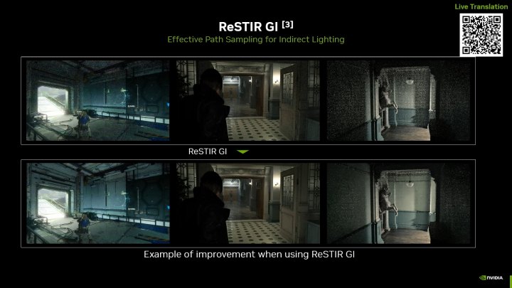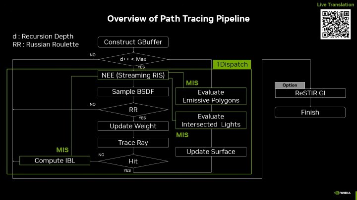 Разработчики реализовали разные оптимизации, например, streaming RIS для эффективного выбора важных источников света, выбор семплов по алгоритмам BSDF и прочие специфические функции. Затем идет обработки с помощью ReSTIR GI для стабилизации качества реконструкции лучей DLSS путем уменьшения шума в непрямом освещении.