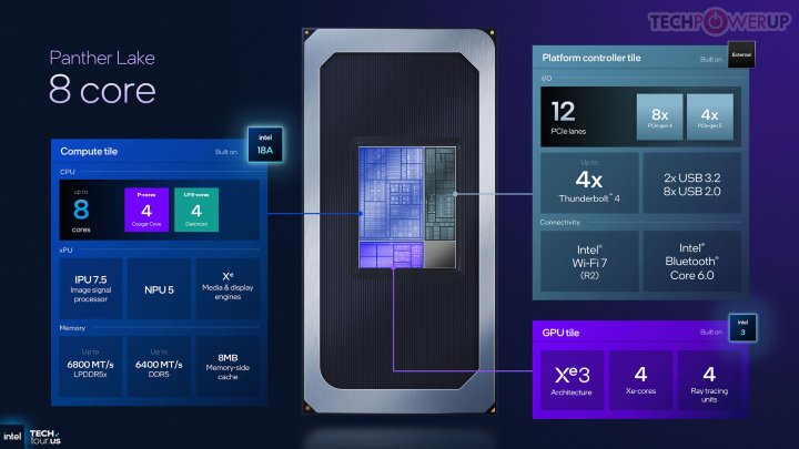 Техпроцесс Intel 18A обеспечивает повышенную плотность c транзисторами нового типа RibbonFET и системой подачи питания с обратной стороны PowerVia. Также Intel использует технологию упаковки Foveros для объединения нескольких кристаллов в единый кремниевый чип. Модульная конструкция повышает выход годных изделий и позволяет использовать наиболее подходящий технологический узел для каждого кристалла.