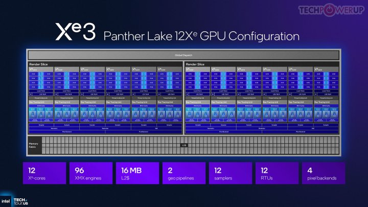 Это два варианта процессора с акцентом на процессорные ядра и большой гибридный процессор с мощным iGPU (12 ядер Xe3). Графика на основе последней архитектуры Battlemage Xe3 (Intel Arc B) с увеличенным кэшем, более быстрой обработкой трассировки лучей и другими улучшениями. Один блок Xe3 примерно на 50% производительнее старого блока Xe2 в процессорах Lunar Lake. Важная инновация в новой графике — появление технологии XeSS 3 Multi Frame Generation для создания нескольких дополнительных интерполированных кадров по аналогии с NVIDIA DLSS 4 MFG.