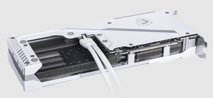 Внешне видеокарта напоминает стандартную модель GeForce RTX 5070 Ti Ventus 3X, но в белом цвете. Сзади есть металлическая пластина на магнитах, снятие которой открывает доступ к отсеку для подключения внешнего питания. При этом кабель будет минимально выпирать снаружи. Это заодно снижает риск плохого контакта в разъеме питания 12V-2x6 из-за изгиба толстого кабеля.