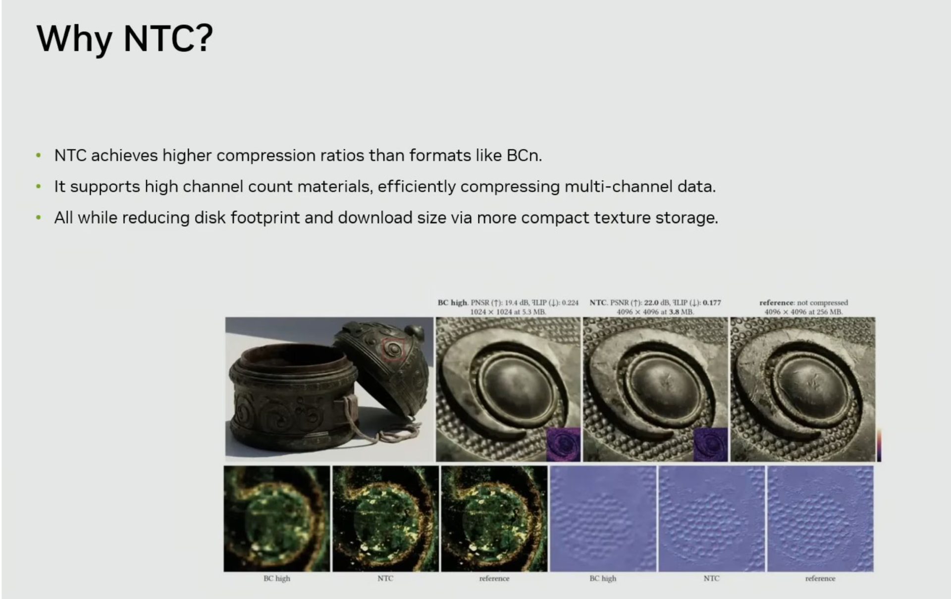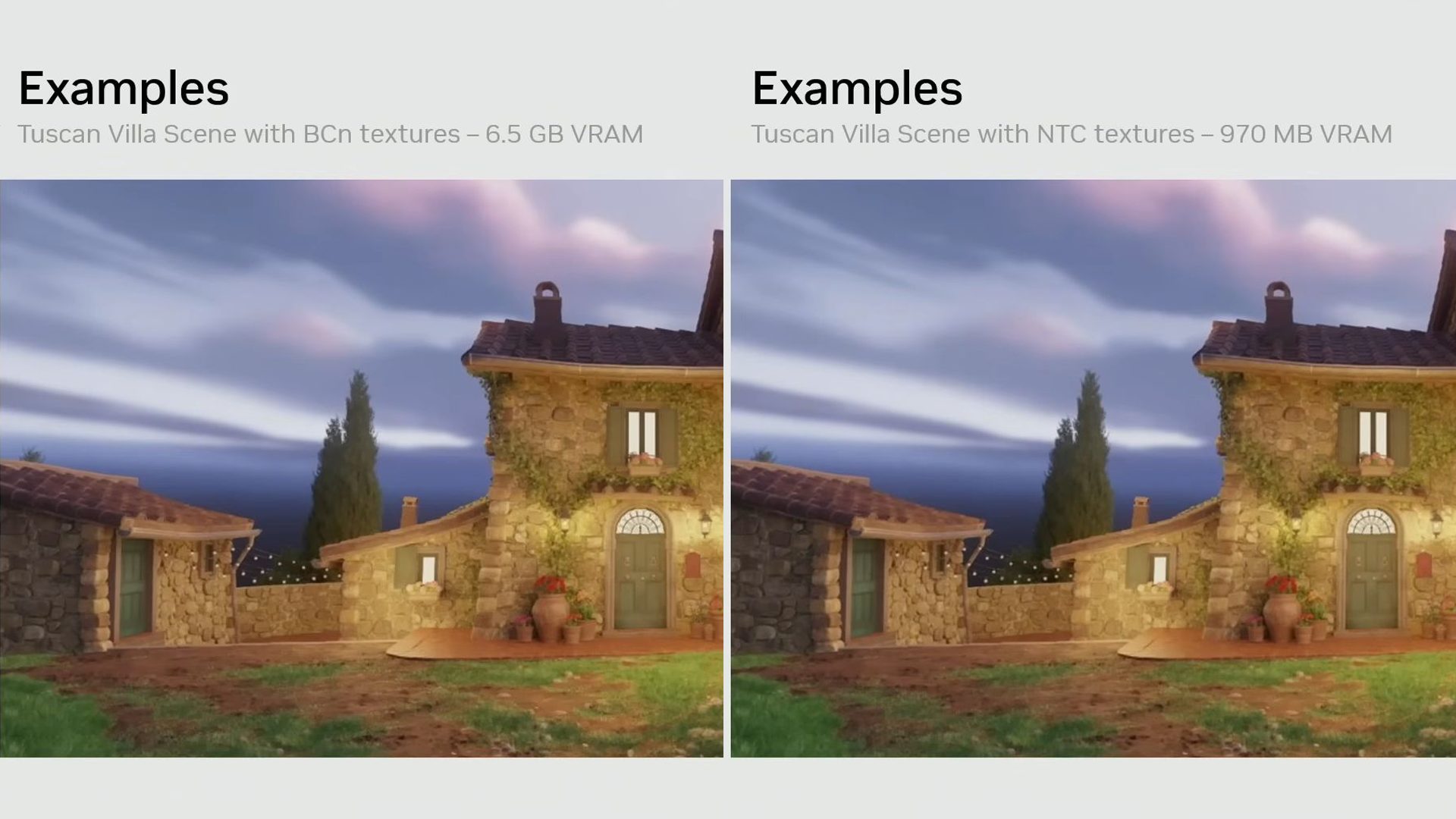 Технология RTX Neural Texture Compression (NTC) была анонсирована еще в 2023 году. Поддержка этого сжатия официально заявлена для GPU Blackwell в видеокартах GeForce RTX 50. Но практического применения технология пока не получила. На конференции была продемонстрирована сцена Tuscan Wheels. При использовании традиционных текстур с блочным сжатием BCN загрузка видеопамяти в сцене составляла 6,5 ГБ, а при использовании NTC лишь 970 МБ. При этом NTC сохраняет больше деталей, чем обычное сжатие.
