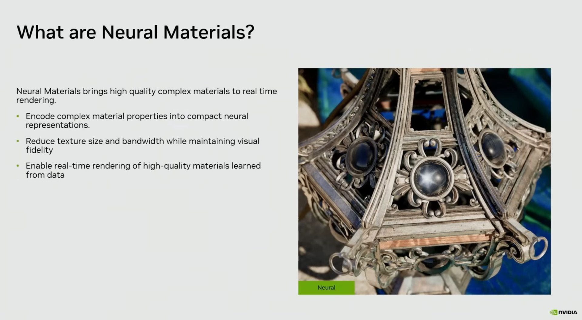 Также NVIDIA продвигает технологию RTX Neural Materials для нейронного сжатия данных о свойствах материалов. Это метод аппроксимации и сжатия свойств для последующего декодирования с помощью небольшой нейросети. В демонстрации конфигурация материала с 19 каналами была сокращена до восьми каналов, а временя рендеринга в разрешении 1080p сократилась в 1,4–7,7 раз в тестовой сцене.