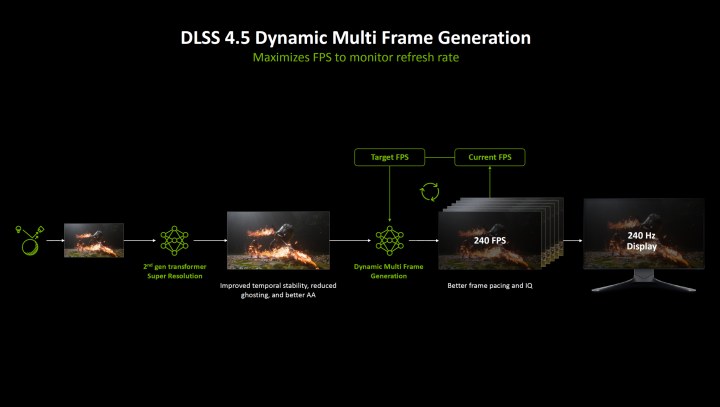 Новый режим Dynamic MFG 6X вместе с масштабированием позволяет играть при стабильных 240 кадрах на 4K-мониторах 240 Гц даже с максимальной графикой и трассировкой.