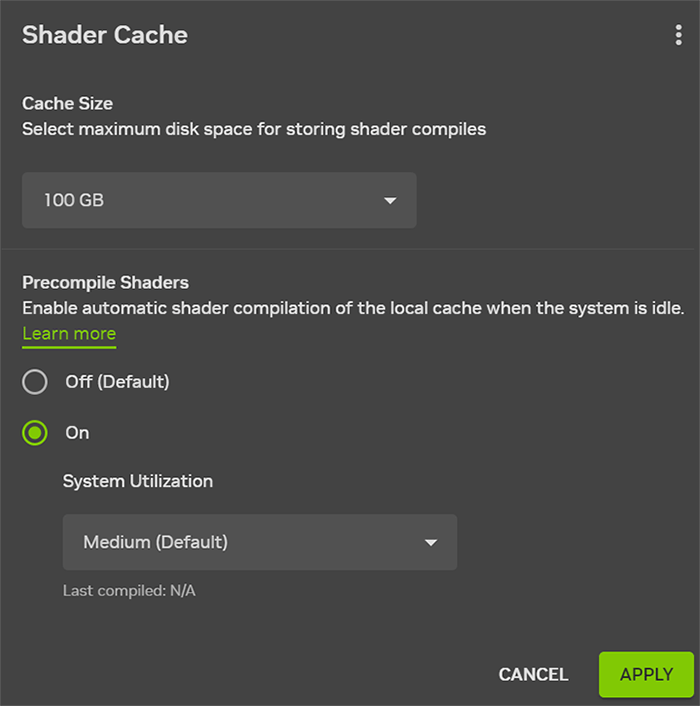 Для работы новой функции требуется драйвер GeForce Game Ready Driver 595.97 WHQL или новее. Пользователь может указать приоритет для компиляции и задать объем доступного дискового пространства.