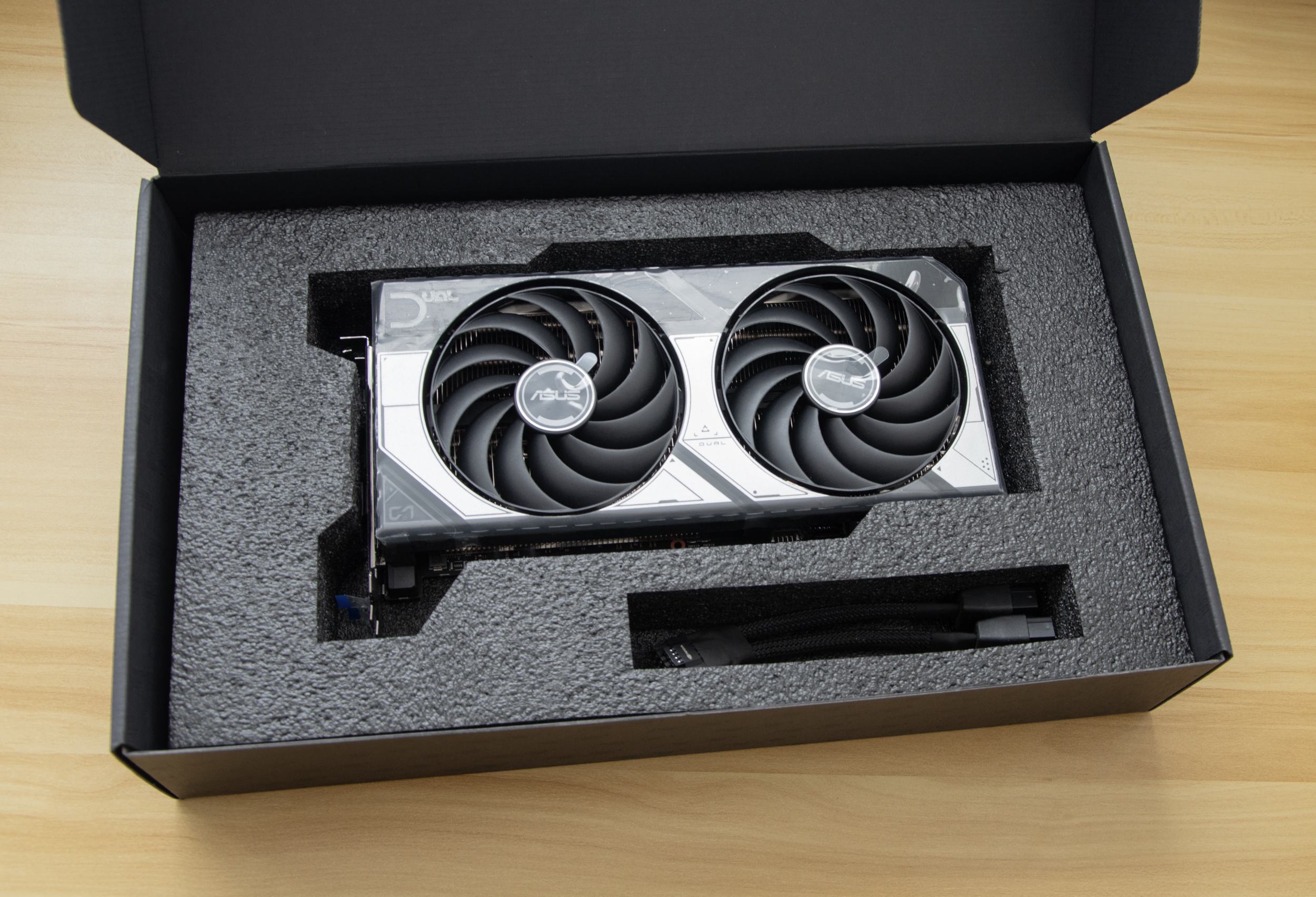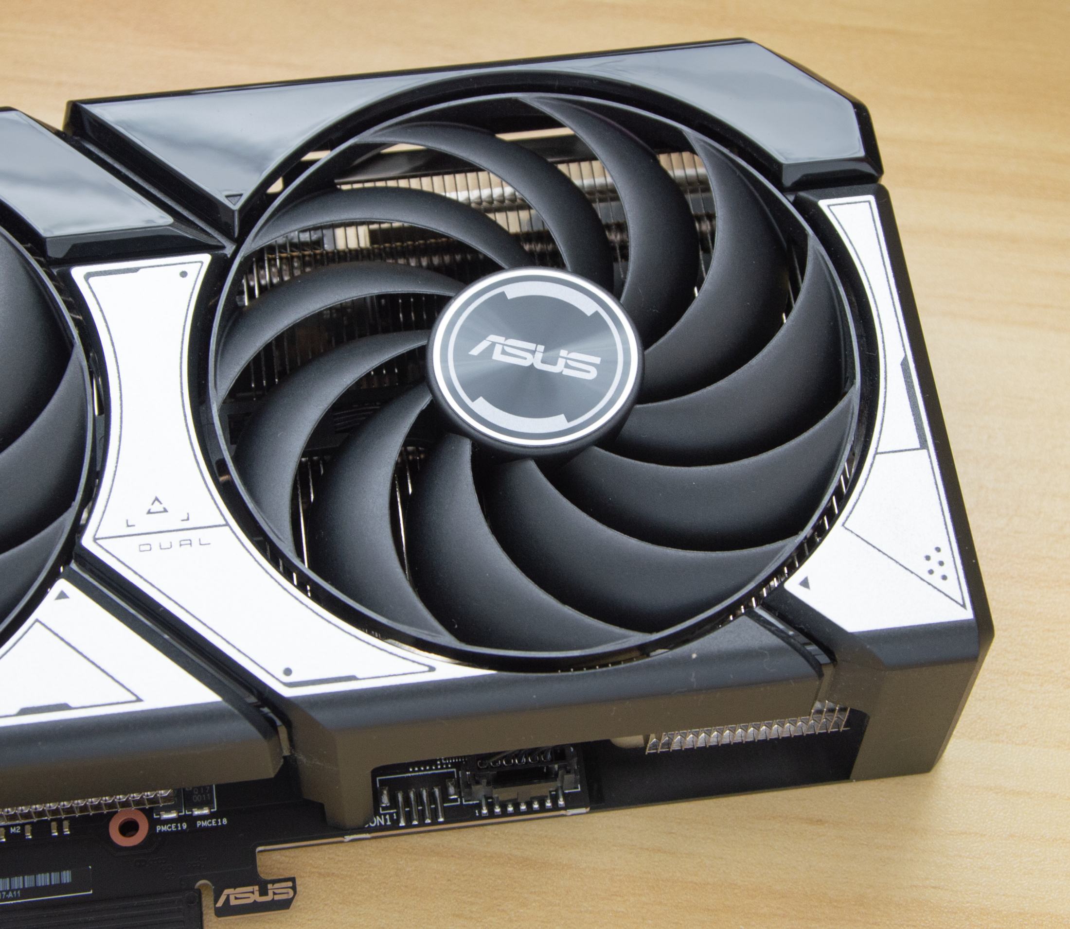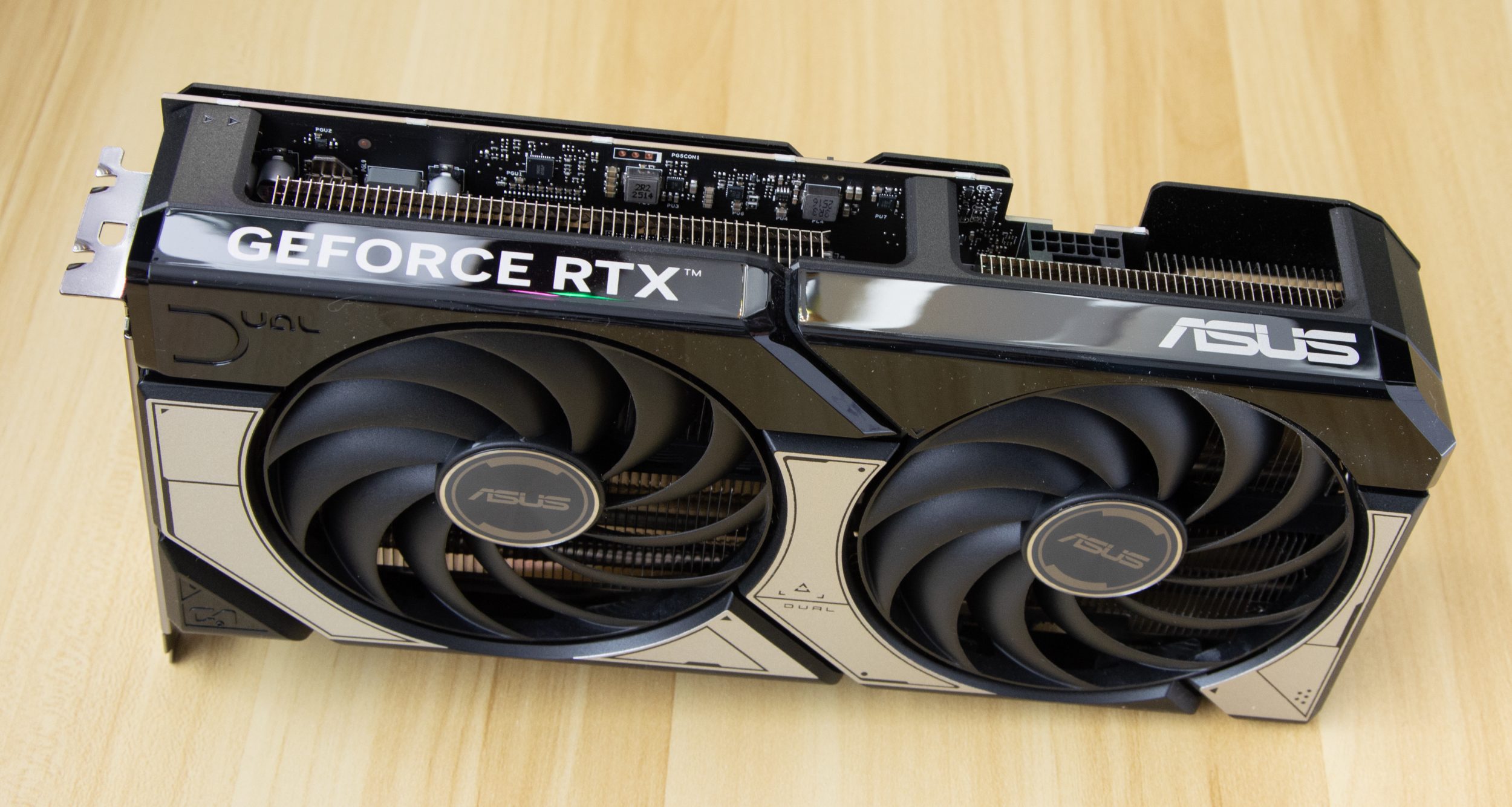 Видеокарта выполнена в индустриальном дизайне, который сочетает черный кожух с элементами цвета металлик. Сверху кожух закрыт защитными пленочками, а разъем PCI-E на время транспортировки закрыт заглушкой, которая защищает от пыли. Основная особенность ASUS Dual — наличие только двух вентиляторов.