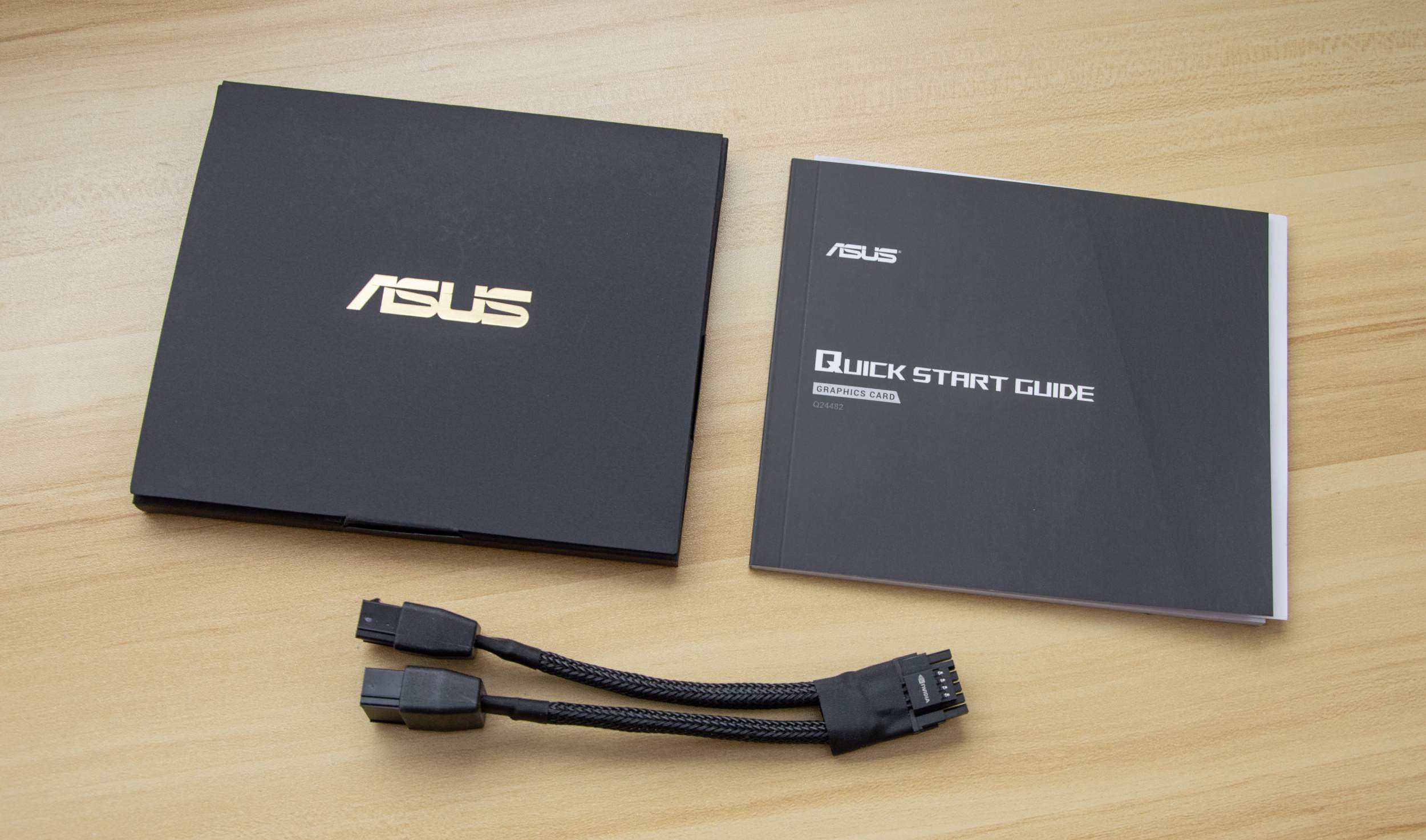 ASUS комплектует все свои видеокарты кабелем-переходником для подключения питания нового стандарта 12V‑2×6 через два стандартных разъема PCI-E 8-pin. В отдельном конвертике присутствует инструкция по установке.