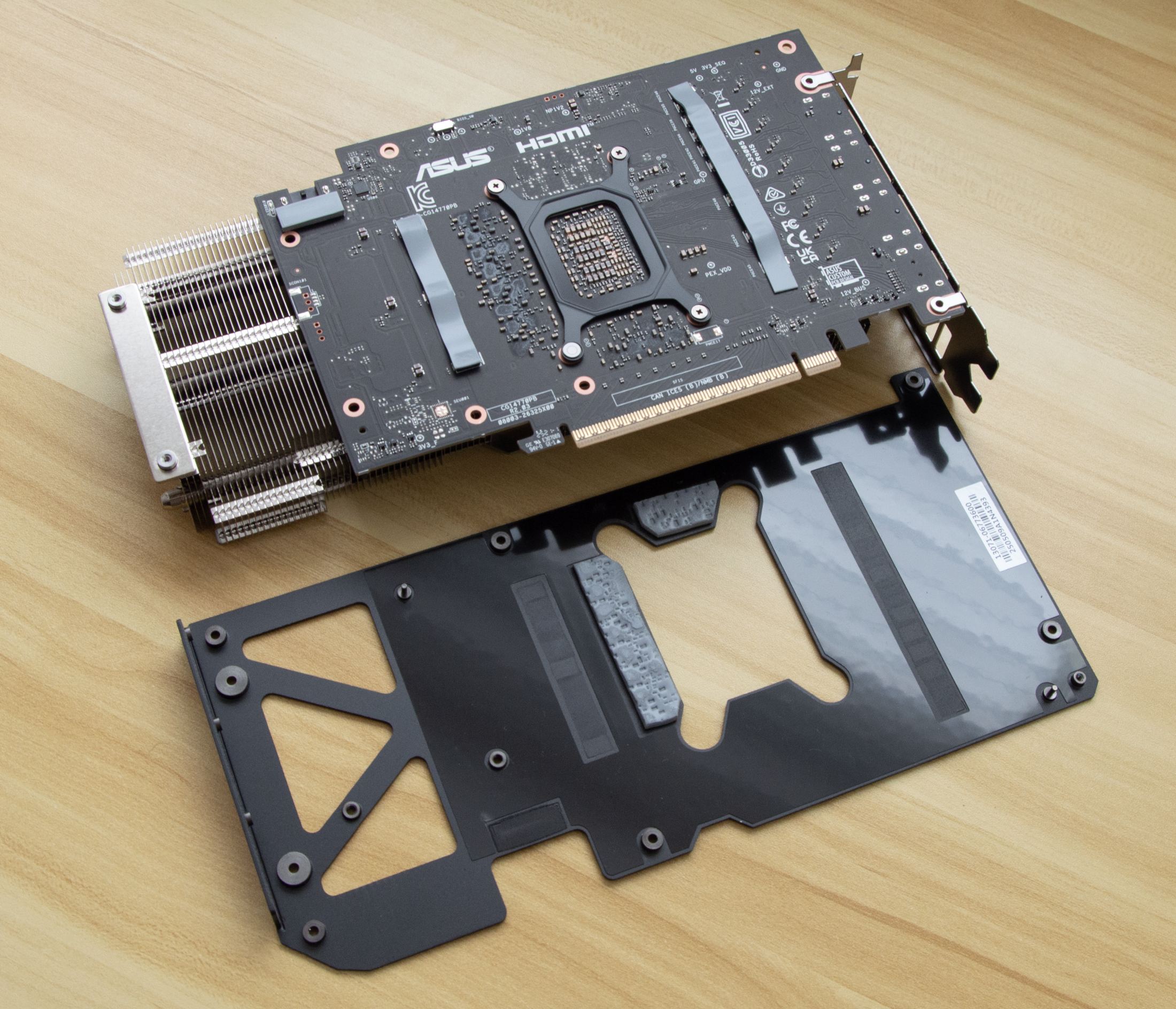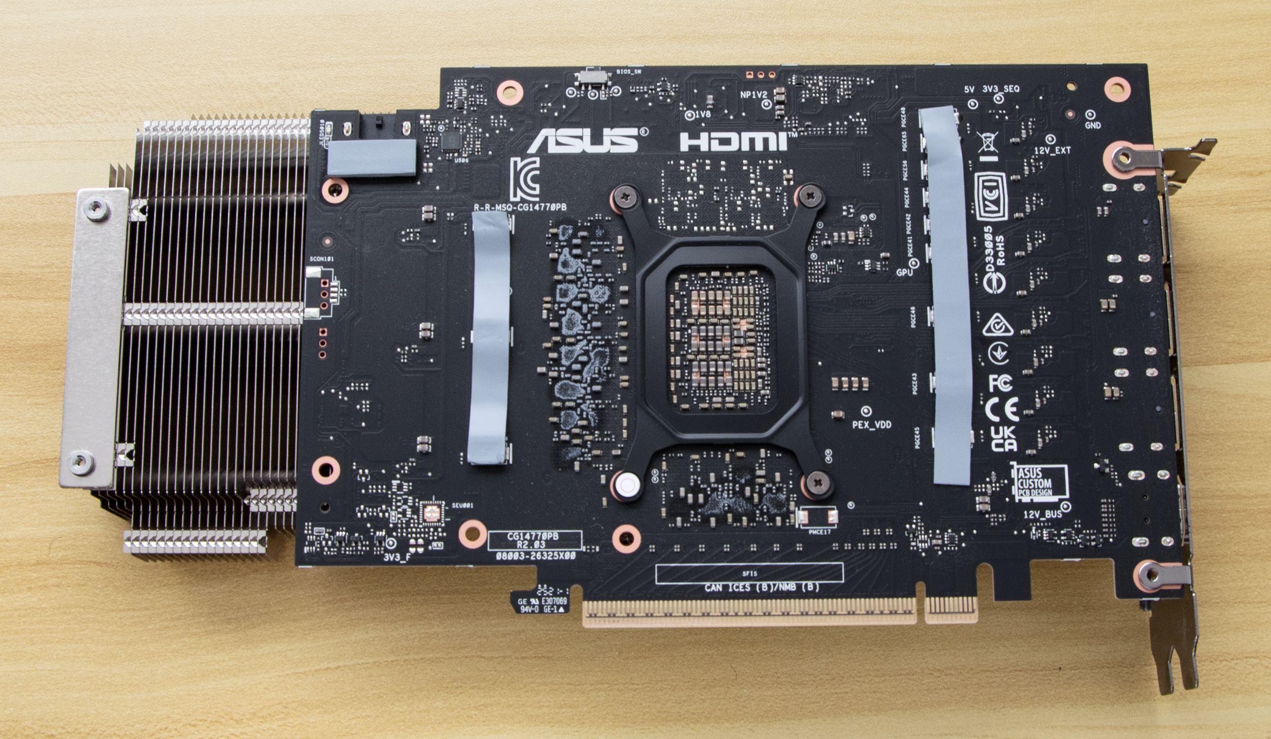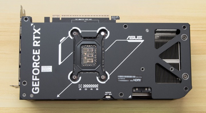 На печатной плате есть штамп о том, что это кастомный дизайн ASUS. При сравнении задней стороны с платой от трехвентиляторной ASUS GeForce RTX 5070 TUF из обзора на TechPowerUp выявлено много схожего. Питание памяти реализовано по одной схеме, а развязка узла питания графического немного отличается. Очевидно, что у бюджетной версии должны быть небольшие упрощения, и у питания GPU будет меньше фаз.