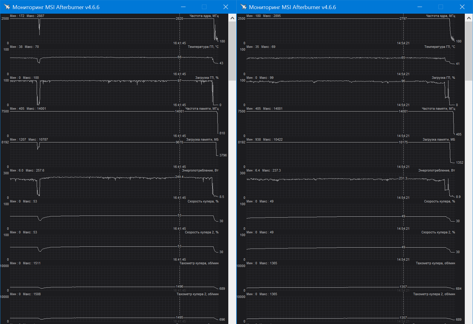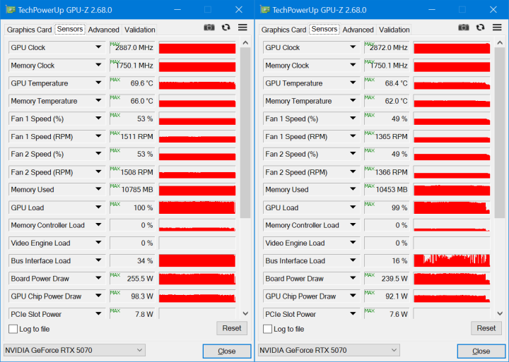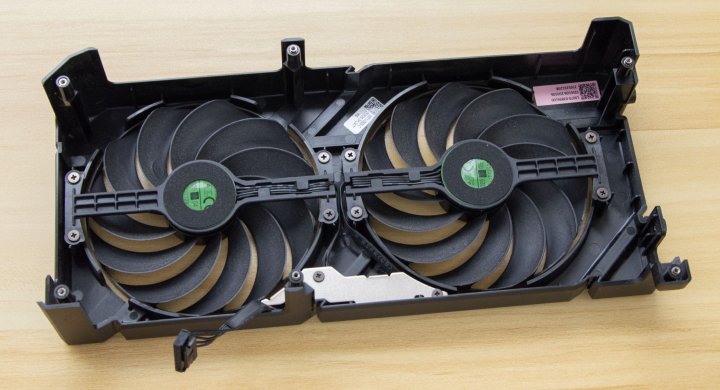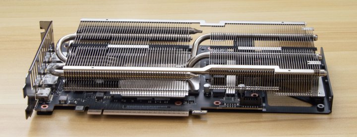 При эксплуатации в открытом корпусе нагрев уменьшился до 70 °C, а скорость вентиляторов снизилась до 1500 об/мин. Причем такие параметры видеокарта достигала при высоких настройках графики в 4K. С понижением разрешения до 2560x1440 нагрев в тех же играх снижался до пиковых значений в 68 °C при скорости вентиляторов 1350 об/мин. Мощность в 250 Вт достигалась лишь в некоторых играх и тяжелых режимах, в некоторых приложениях видеокарта потребляла лишь 230-240 Вт.