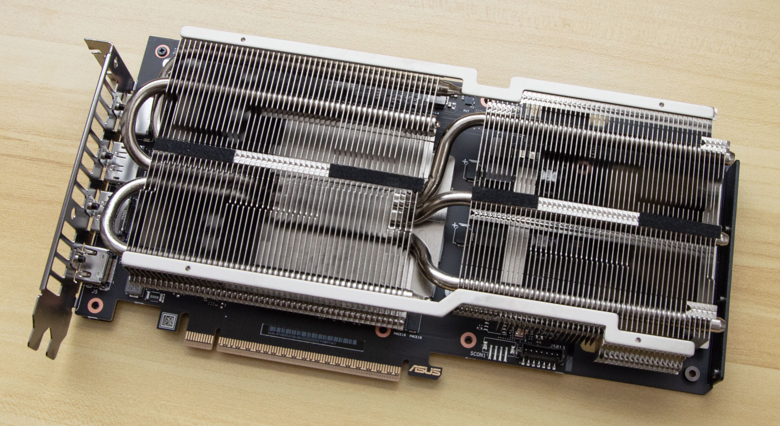 Конструкция радиатора напоминает охлаждение от более дорогих видеокарт ASUS TUF, но компактнее в размерах. Это двухсекционный радиатор с несколькими тепловыми трубками (вероятно, их три). Трубки проходят через основание в зоне чипа и пронизывают все пластины, делая изгиб в левой части..