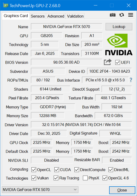 ASUS Dual GeForce RTX 5070 OC использует графический процессор GB205-300-A1, у которого активно 6144 ядер CUDA, 192 текстурных блока и 192 тензорных блока при 48 ядрах RT для трассировки. Шина памяти 192 бита, общий объем памяти 12 ГБ. Приставка OC в названии видеокарты намекает на заводской разгон. NVIDIA предусматривает для GeForce RTX 5070 базовую частоту 2325 МГц при Boost Clock 2512 МГц. Данная модель ускорена по Boost Clock до 2542 МГц, что сочетается со стандартным ограничением по мощности в 250 Вт. То есть реальная производительность будет близка к стандартному уровню GeForce RTX 5070. Основная частота памяти 1750 МГц, эффективная скорость обмена данными 28 Гбит/с, что полностью соответствует рекомендациям NVIDIA.