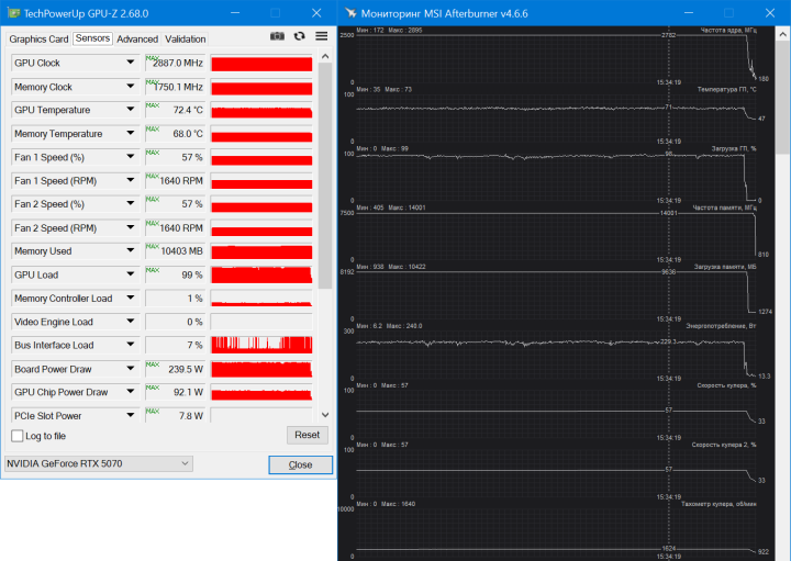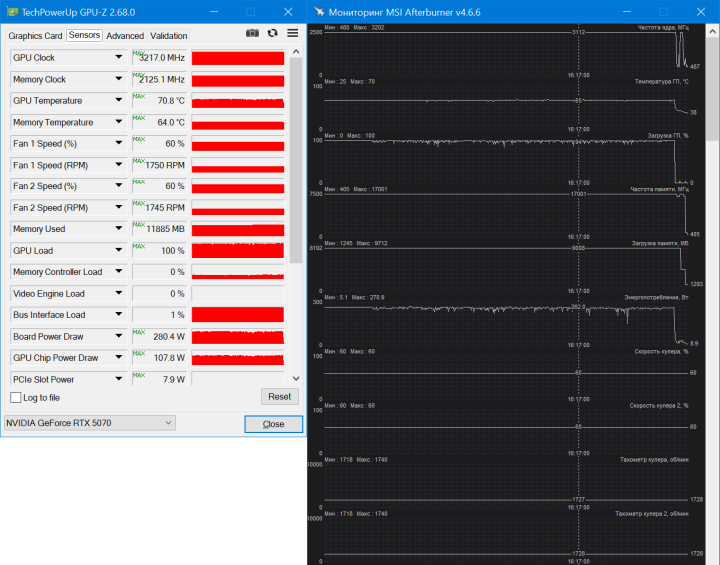 Внутри такого корпуса после 40-минутной игровой сессии в Cyberpunk 2077 и The Elder Scrolls IV: Oblivion Remastered температура графического чипа достигала пиковых значений в 73 °C, а вентиляторы раскручивались до 1600 об/мин. GPU работал при частотах около 2800 МГц, что весьма неплохо. Судя по обзорам, схожие частоты показывают видеокарты и с большим заявленным заводским разгоном.