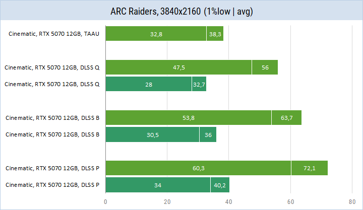 ARC Raiders хорошо идет на GeForce RTX 5070. С видеокартой среднего уровня можно получить комфортный fps в 4K при настройках Epic и качественных режимах DLSS или при сочетании Cinematic с DLSS Performance. И это без учета генерации кадров. Multi Frame Generation позволяет серьезно увеличить частоту кадров, улучшить плавность игрового процесса и использовать более качественные режимы. Главным условием является базовая производительность без генерации в 50 fps и более для хорошей отзывчивости игры. Результаты этой модели указывают на возможность получить камфорную производительность в Full HD и 1440p на GeForce RTX 5060 Ti.