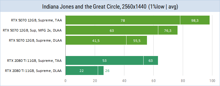 В повышенном разрешении при TAA преимущество GeForce RTX 5070 над GeForce RTX 2080 Ti около 50%. В этот раз видеокарты резко теряют производительность после включения DLAA — результаты новой видеокарты падают на 90%, а у старой падение более двух раз. Это тот случай, когда мы уперлись в объем памяти. Также активация DLAA совместно с текстурами в Supreme-режиме часто приводит к вылетам на обоих видеокартах. Поэтому рекомендуем параметр «Объем памяти текстур» снизить до уровня Ultra. В случае GeForce RTX 5070 можно еще активировать генерацию кадров — в самом простом режиме Multi Frame Generation 2x общие показатели повышаются на 30-50%.
