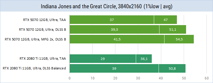 GeForce RTX 5070 быстрее GeForce RTX 2080 Ti на 30% при нативном разрешении с TAA, но они почти идентичны в режиме с DLSS Balanced. Снова память начинает ограничивать потенциал GeForce RTX 5070. Стоит отметить, что и включение генерации кадров тут минимально влияет на общие показатели. Также нужно упомянуть проблемы с нестабильной работой, например, активация DLSS и генерации кадров могло приводить к падению fps. Работа ИИ-модели DLSS тоже требует ресурсов и памяти, и в случае их дефицита возможна такая некорректная работа. В Indiana Jones and the Great Circle лучше поступать так: загружать сохранение с TAA, а уже после загрузки локации менять TAA на DLSS. Также для 11-12 ГБ видеопамяти мы рекомендуем ограничить стриминг текстур (Texture Pool Size) уровнем High. При этом в режиме текстур Supreme игра на таких видеокартах просто не загружается.