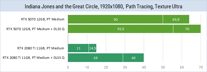 Indiana Jones and the Great Circle действительно может создать трудности для GeForce RTX 5070 с 12 ГБ памяти. Результаты в 4K явно демонстрируют, что объем памяти ограничивает потенциал данной видеокарты и разница с более старым GPU со схожим объемом памяти может быть небольшой. Но в более низких разрешениях преимущество GeForce RTX 5070 над GeForce RTX 2080 Ti может достигать внушительных 60%. В тяжелых режимах с трассировкой пути отрыв GeForce RTX 5070 приближается к 80%, но по факту видеокарта все равно слабовата для таких настроек. Комфортно играть в Indiana Jones and the Great Circle на GeForce RTX 5070 при высоких разрешениях можно без трассировки пути. Также в высоких разрешениях придется ограничить «Объем памяти текстур» (Texture Pool Size), но его снижение до Ultra практически незаметно — если страдают текстуры отдельных объектов, вы не успеваете это замечать. В целом GeForce RTX 5070 демонстрирует серьезные преимущества над GeForce RTX 2080 Ti даже в условиях ограниченного объема памяти, но в тяжелых графических режимах придется идти на определенные компромиссы.